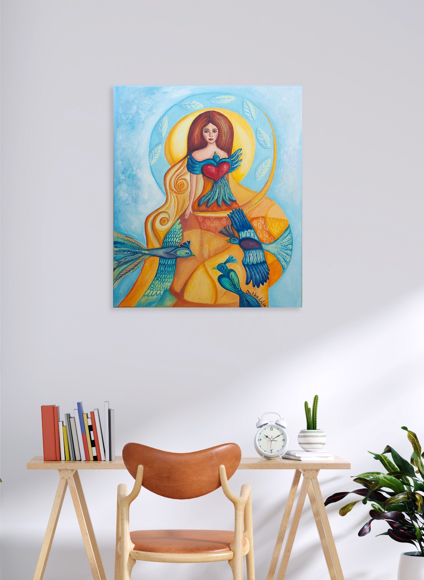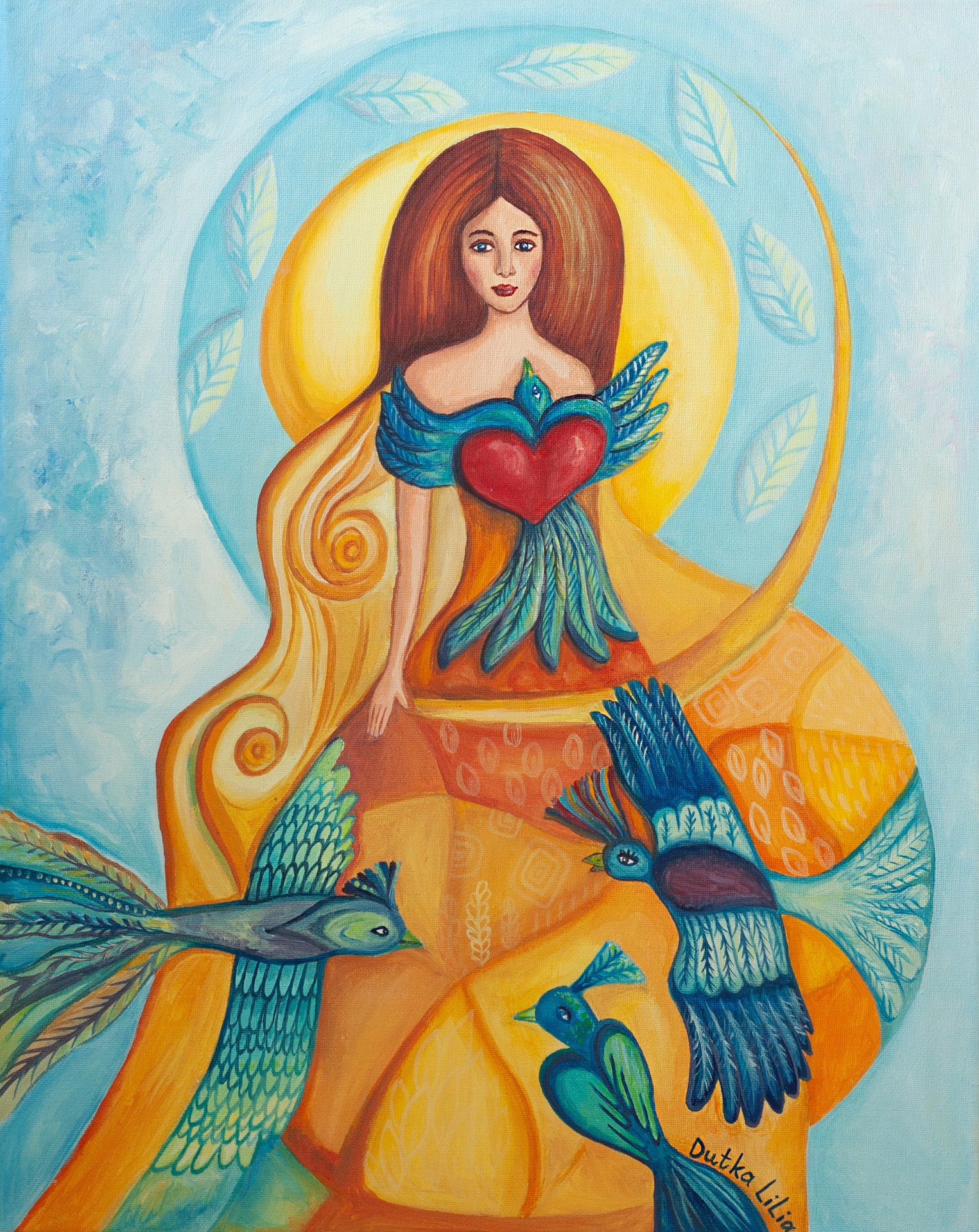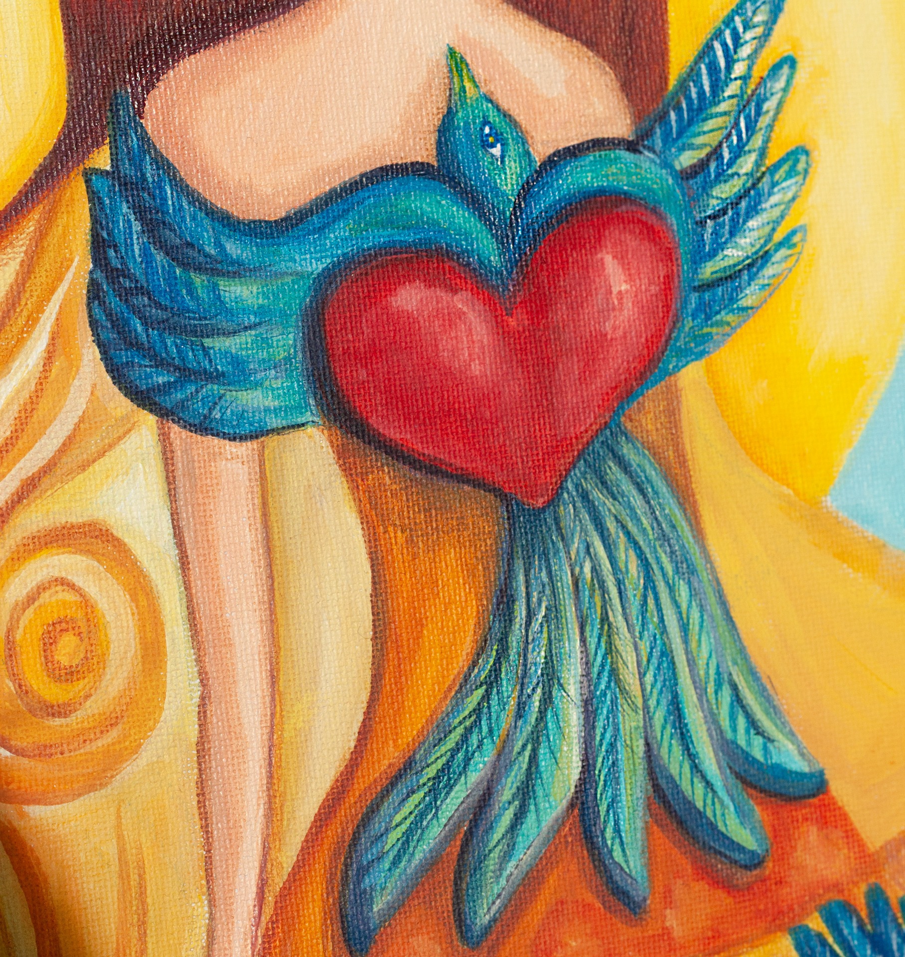 This original acrylic painting, titled "Embrace," captures the graceful harmony between a woman and a bird, symbolizing freedom and connection with nature. The bird gently embraces the woman, representing a sense of love, protection, and unity. The delicate brushwork and vibrant colors create a serene and uplifting atmosphere.