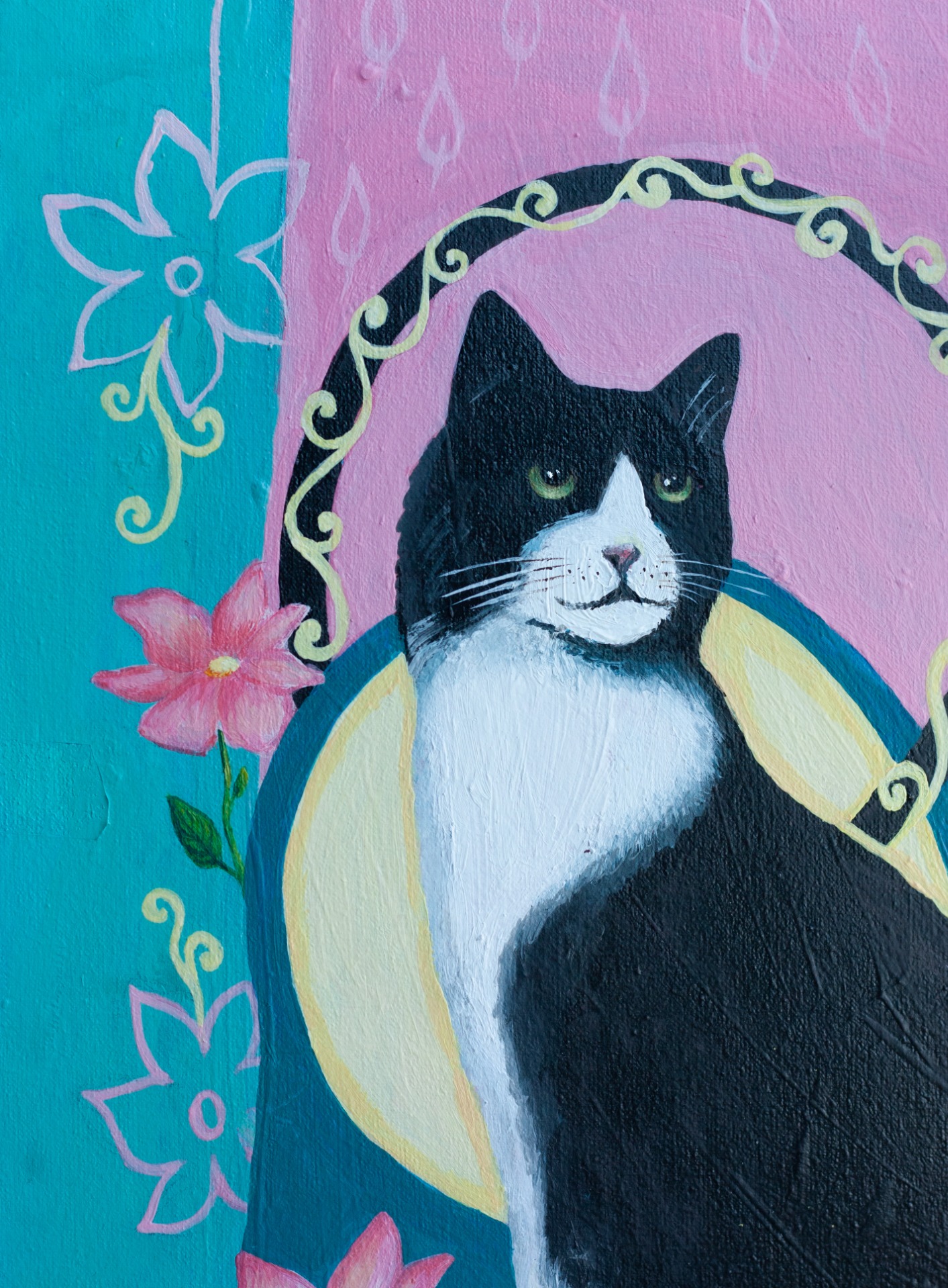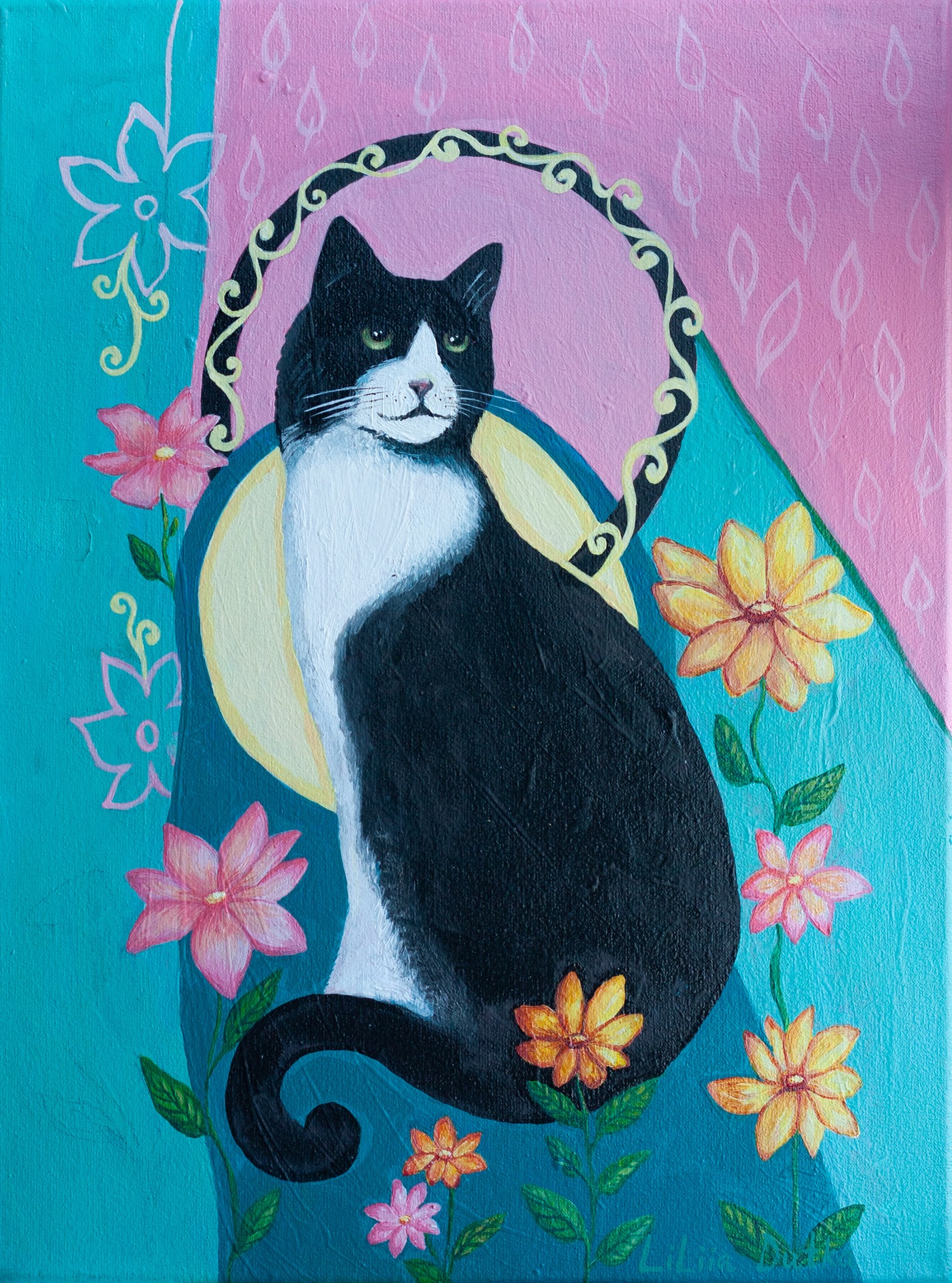 Cats have always been special creatures. They can lie for hours, observing the world around them. This painting depicts a black cat gazing at the beauty of its surroundings.