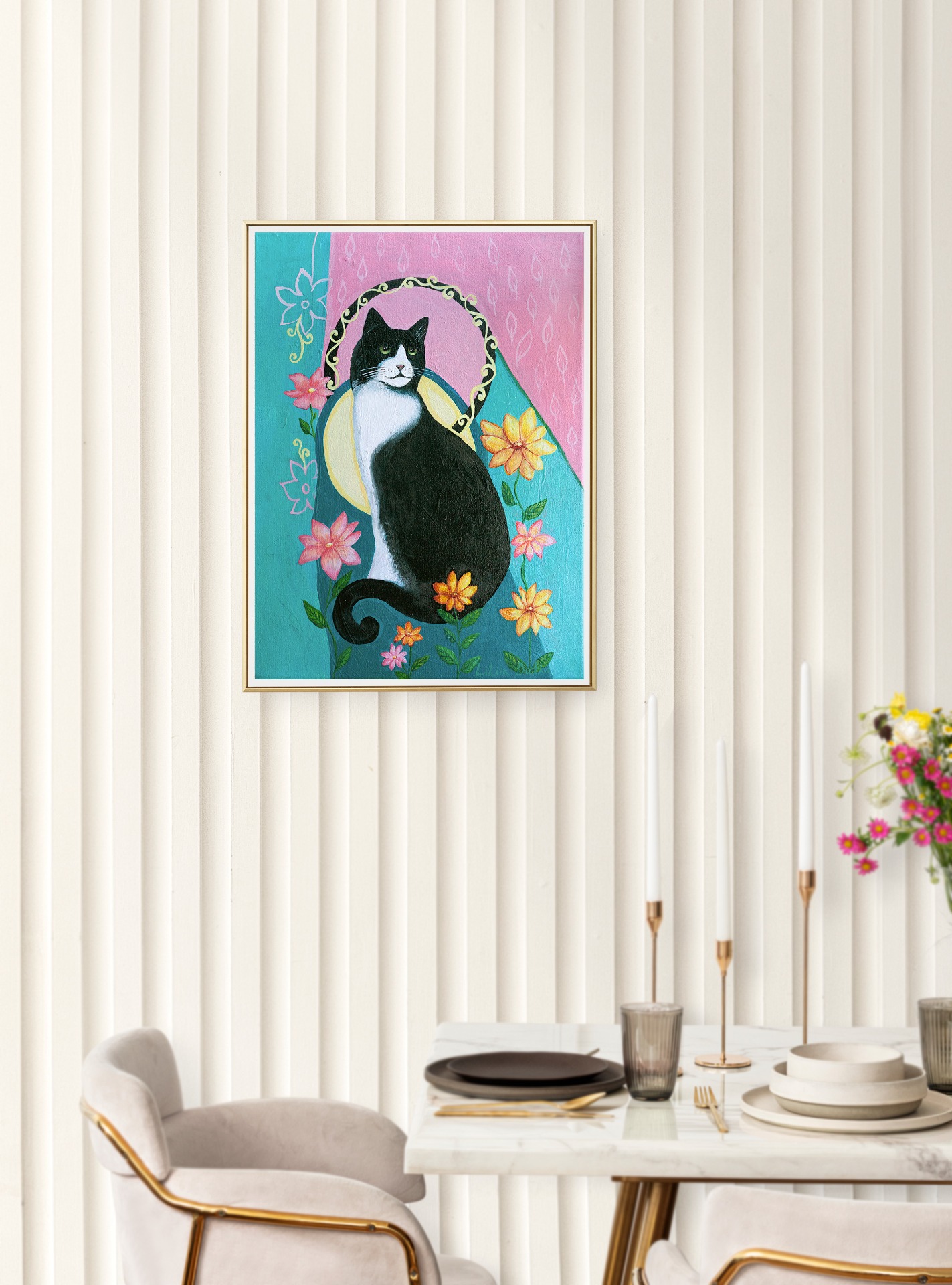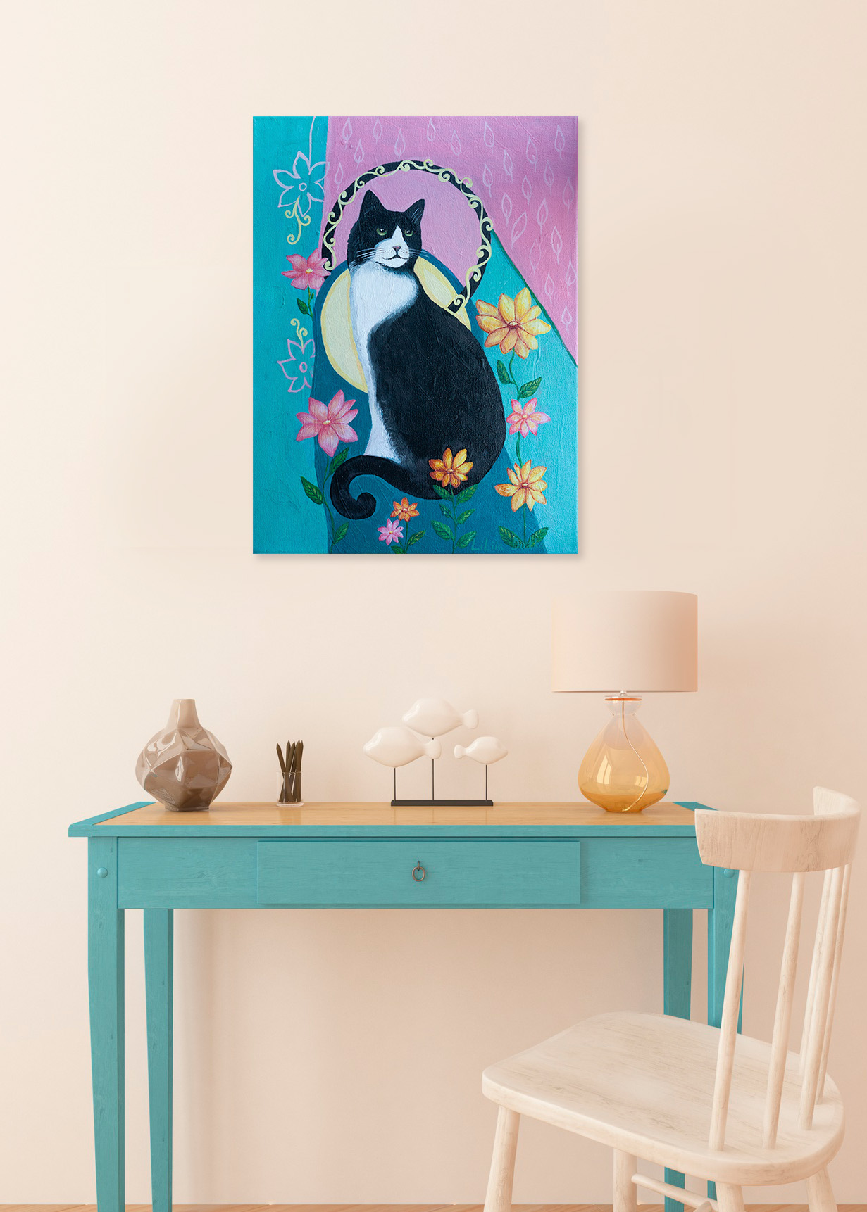 The soft colors and whimsical style create a beautiful, enchanting atmosphere, perfect for sparking imagination and filling the space with warmth and joy. A lovely piece of cat wall decor that adds a charming, fairy-tale feel to any nursery or playroom.