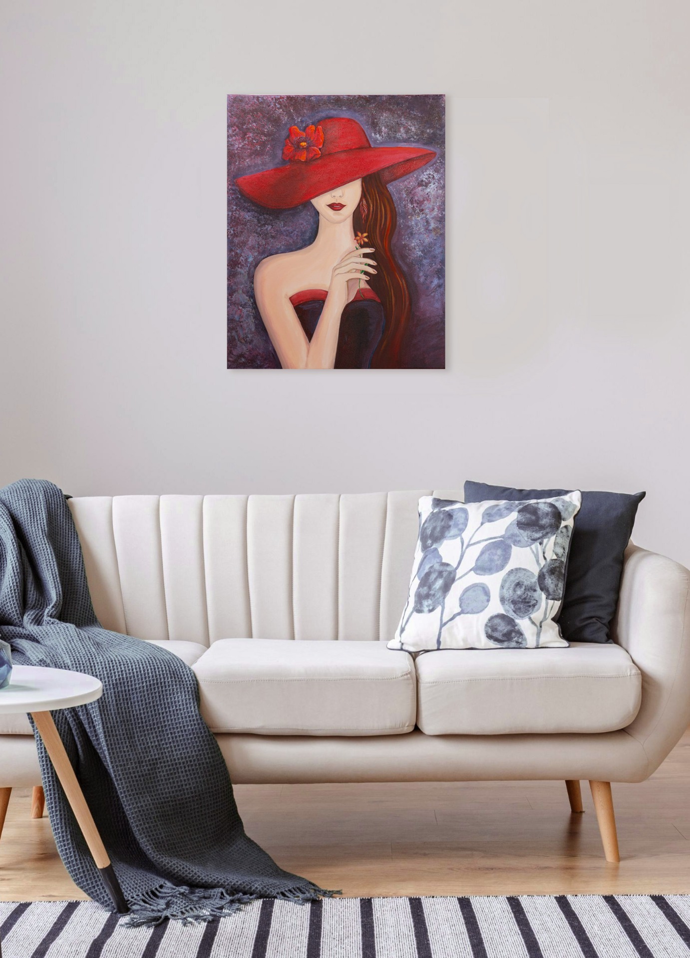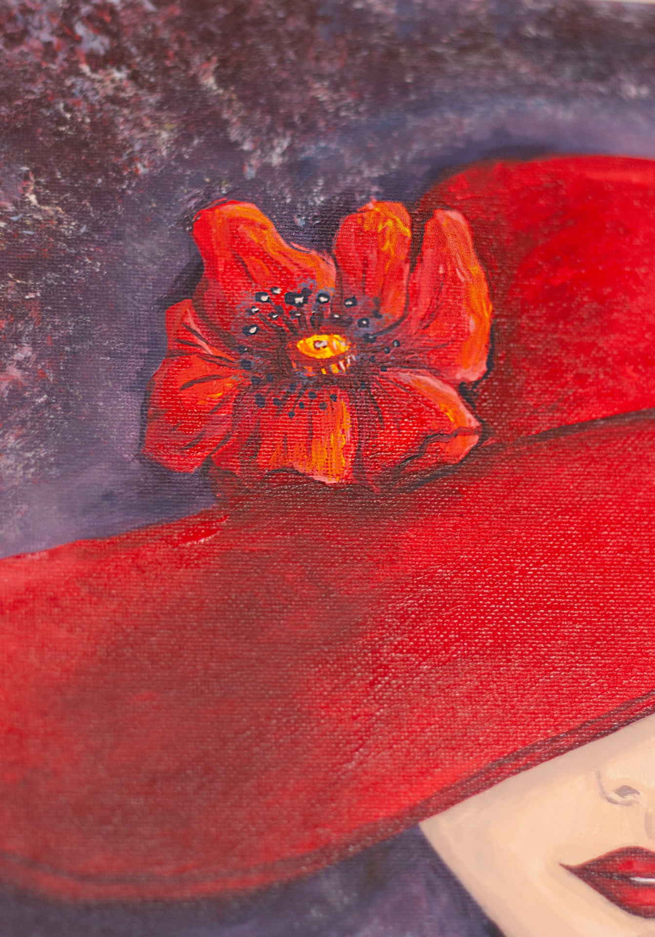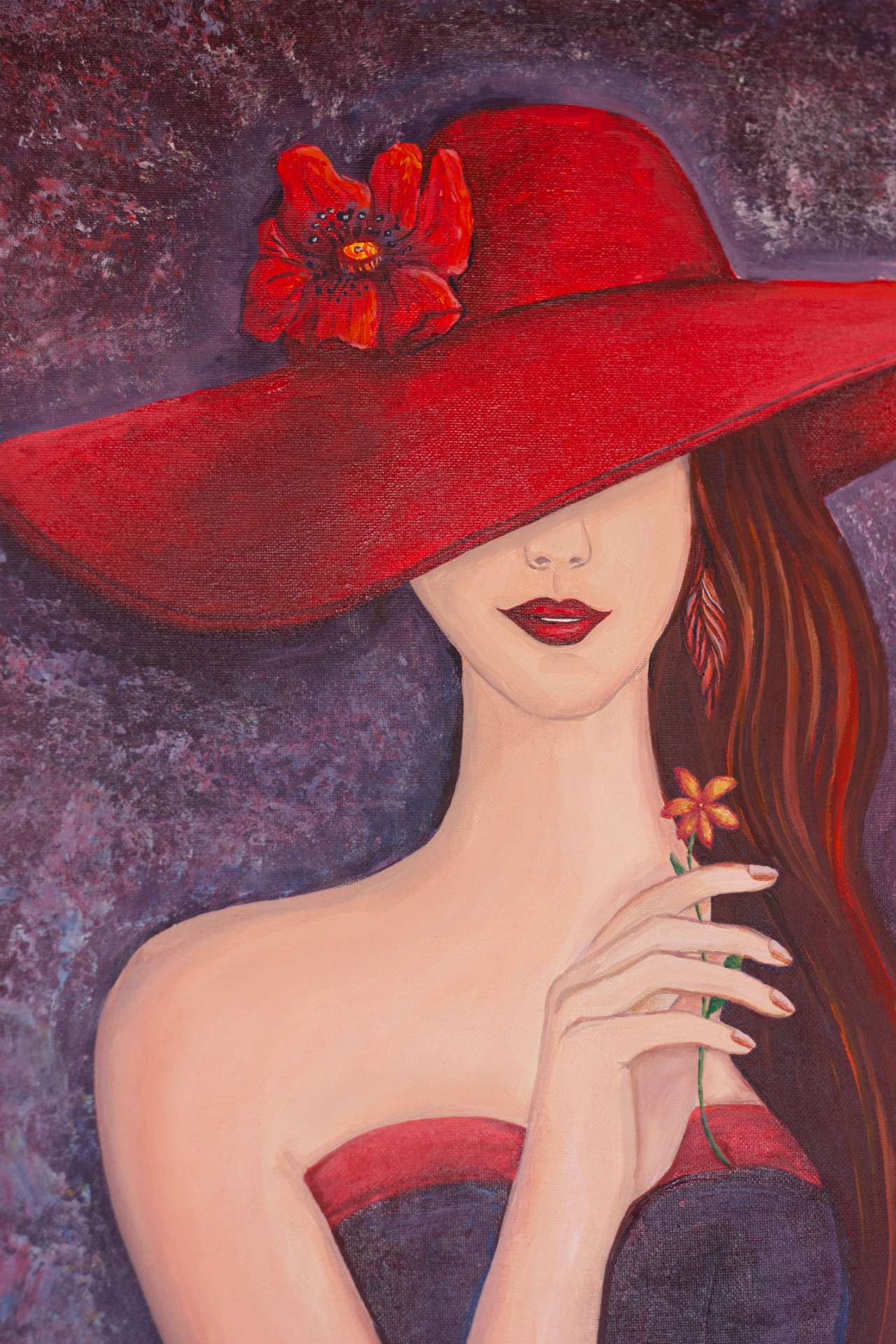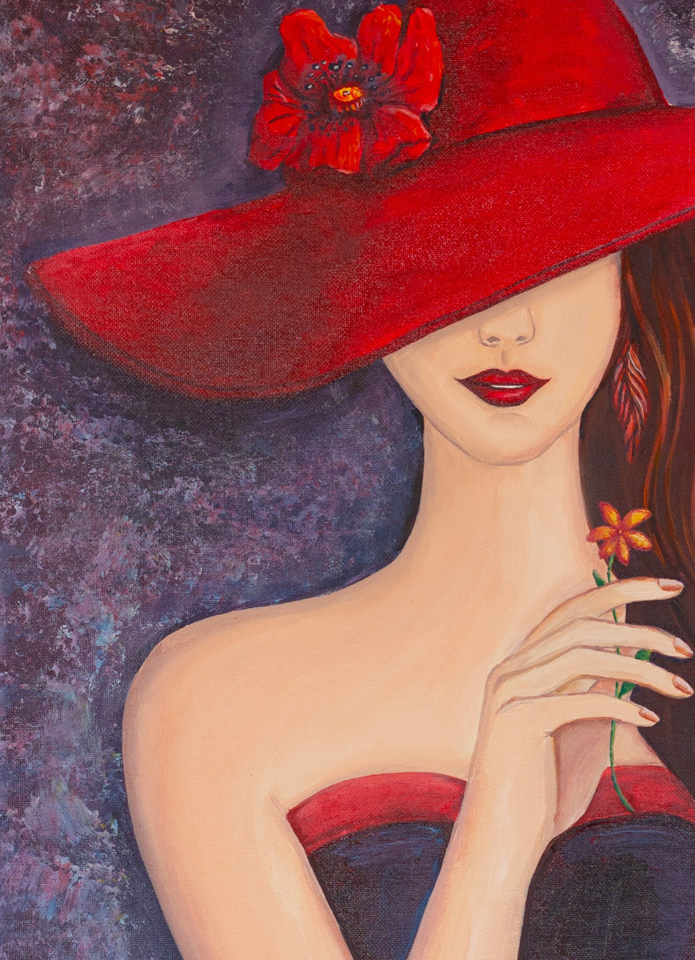 This original acrylic painting, titled "Stranger with a Flower," captures the essence of a woman adorned with a red hat and a vibrant red poppy, exuding a sense of mystery and elegance. The composition blends realism with subtle abstraction, highlighting the subject's serene expression and the delicate interplay of colors. This piece is painted on high-quality canvas, ensuring durability and a professional finish. The artwork is signed by the artist on the front and comes ready to hang, adding a touch of sophistication to any space. Whether as a personal addition to your collection or a thoughtful gift, this painting offers a unique perspective on feminine beauty and grace.